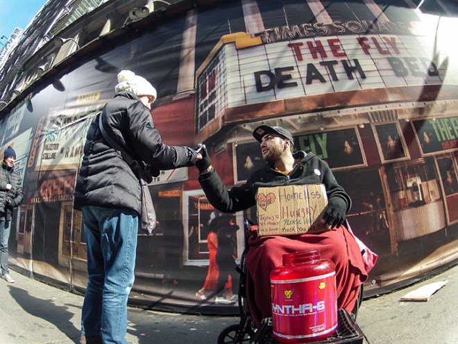 032216-PANHANDLER-DM-8 Panhandler in front of photographic mural depicting Times Square circa 1987, West 42nd Street between 7th and 8th Aves, NYC.
