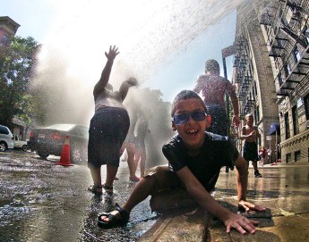 062112-WEATHER-DM-6 Children cooling off in spray of fire hydrant, Washington Heights, West 166th Street, NYC.