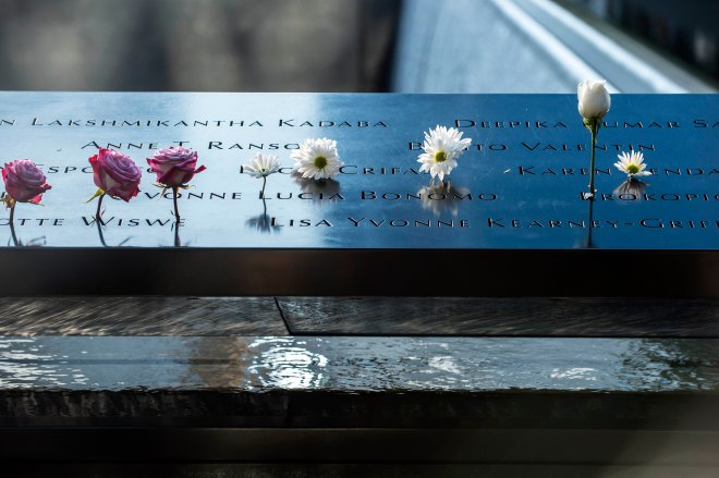 091117-911-MEMORIAL-DM-10 Flowers in names at edge of WTC memorial, at 16th World Trade Center Memorial Service, NYC.