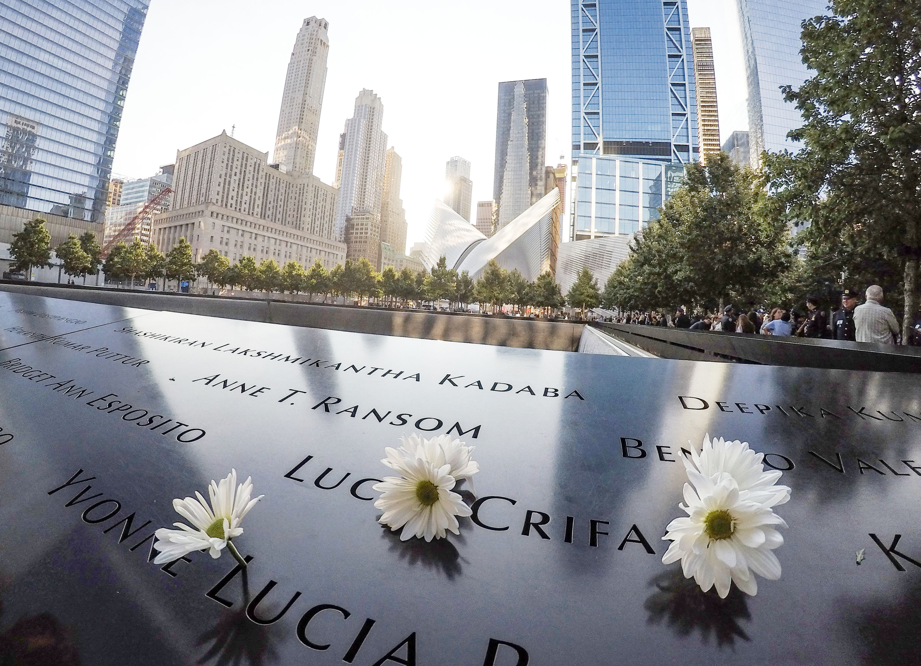 091117-911-MEMORIAL-DM-18 Flowers in names at edge of WTC memorial, at 16th World Trade Center Memorial Service, NYC.