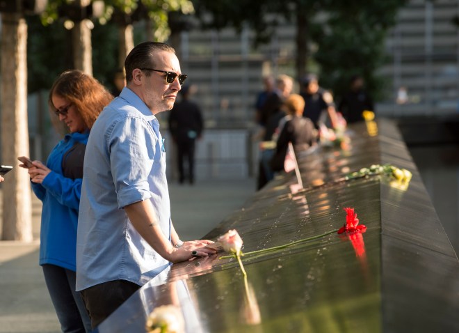 091117-911-MEMORIAL-DM-3 Man at edge of WTC Memorial, at 16th World Trade Center Memorial Service, NYC.