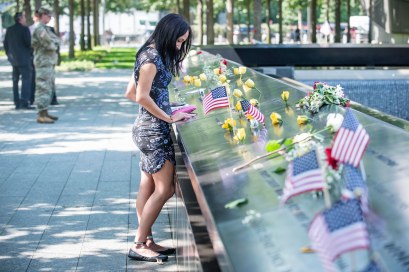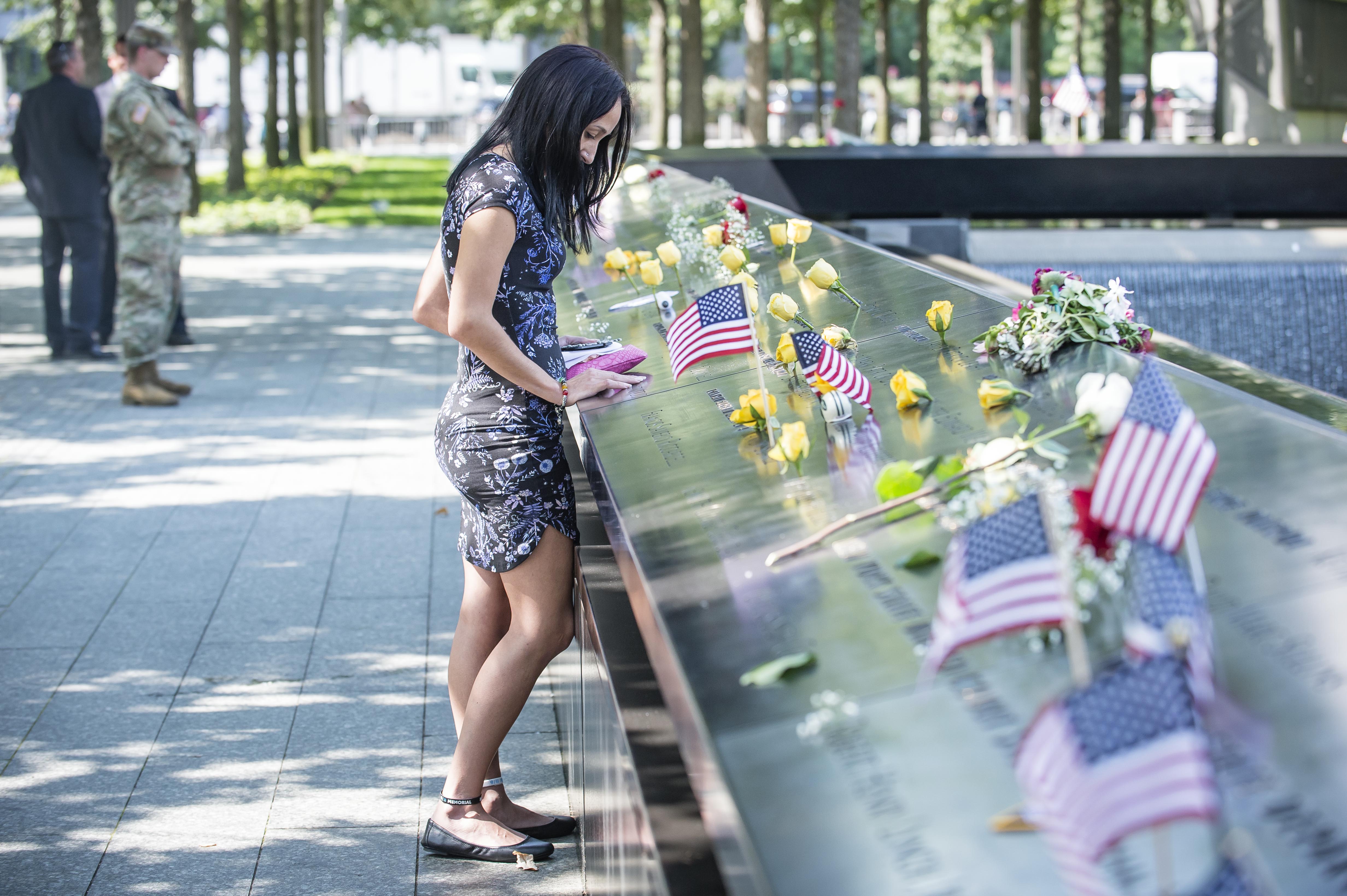 091117-911-MEMORIAL-DM-36 Woman touching name at edge of WTC Memorial, at 16th World Trade Center Memorial Service, NYC.