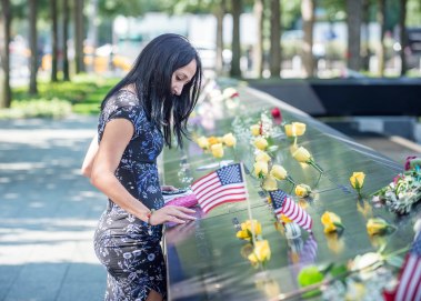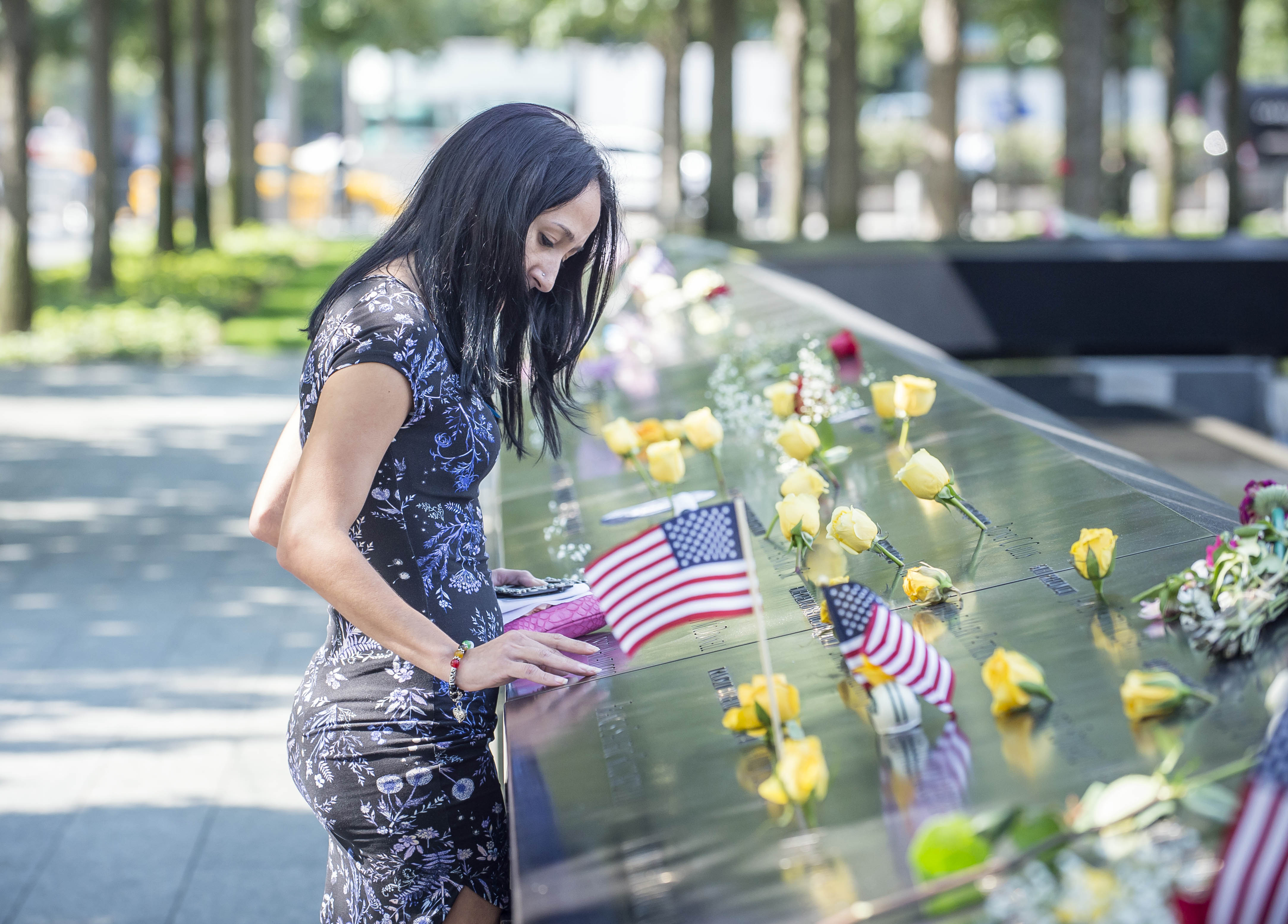 091117-911-MEMORIAL-DM-37 Woman touching name at edge of WTC Memorial, at 16th World Trade Center Memorial Service, NYC.