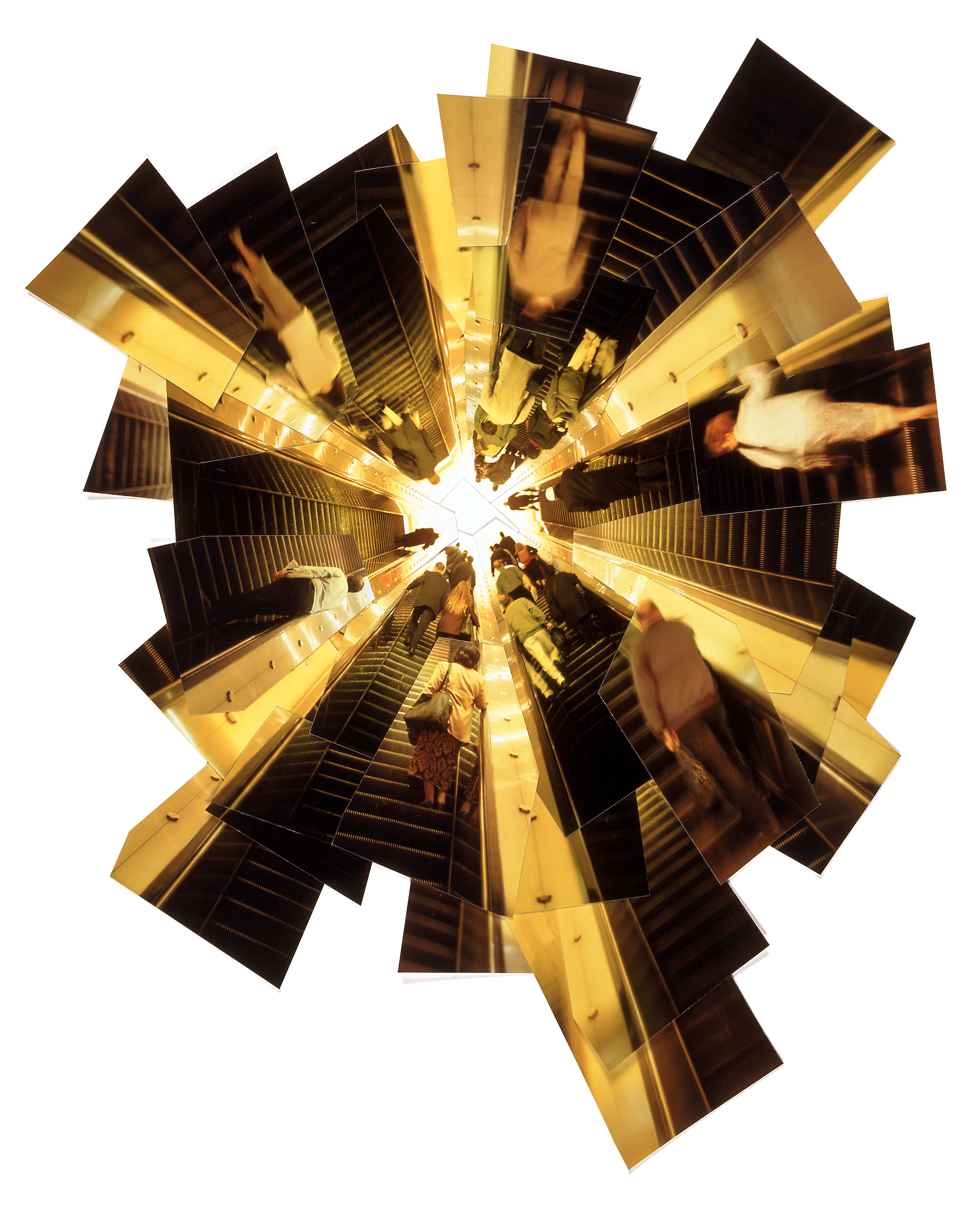 ESCALATORS UP 1997 is an analog photo collage made out of 1-hour prints from color negatives. I had created it back then as a promotional piece for my portfolio. The images here are of the escalator bank from the World Trade Center PATH station, destroyed during the 9/11 attacks. The unwitting, prescient design of people heading heavenward has haunted me ever since the attacks, especially since it is possible that any one of these people, likely headed to work at WTC that day, might have perished in the attacks a few years later.
