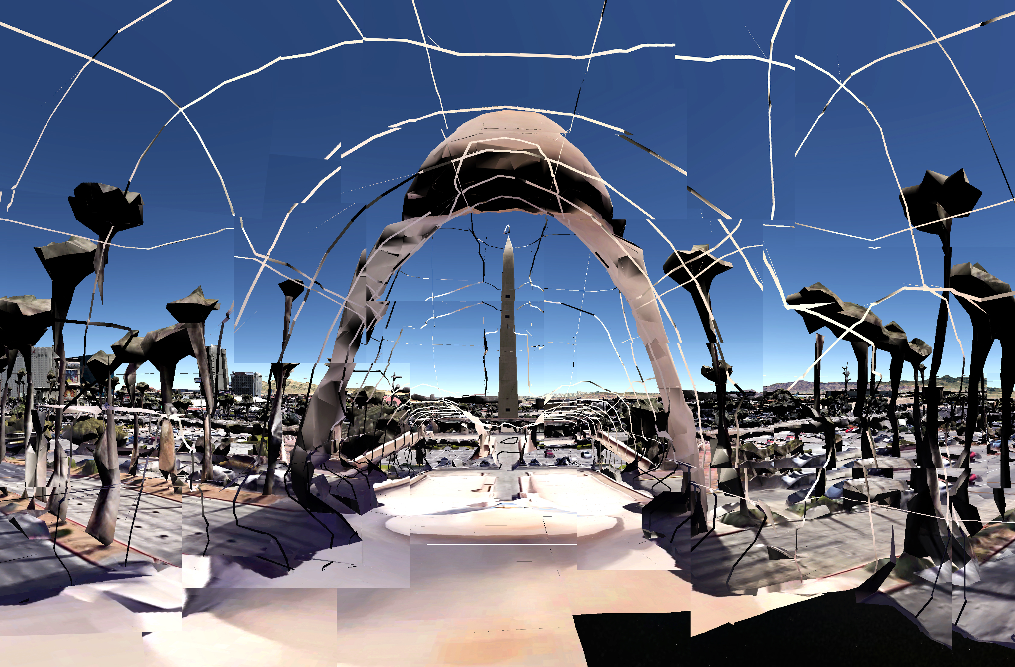 LUXOR REDUX 2017 is a digital photo collage made from imagery found on Google Earth, in the vicinity of the Luxor Hotel in Las Vegas. For more similar images see Google Hack. A detail is shown below: