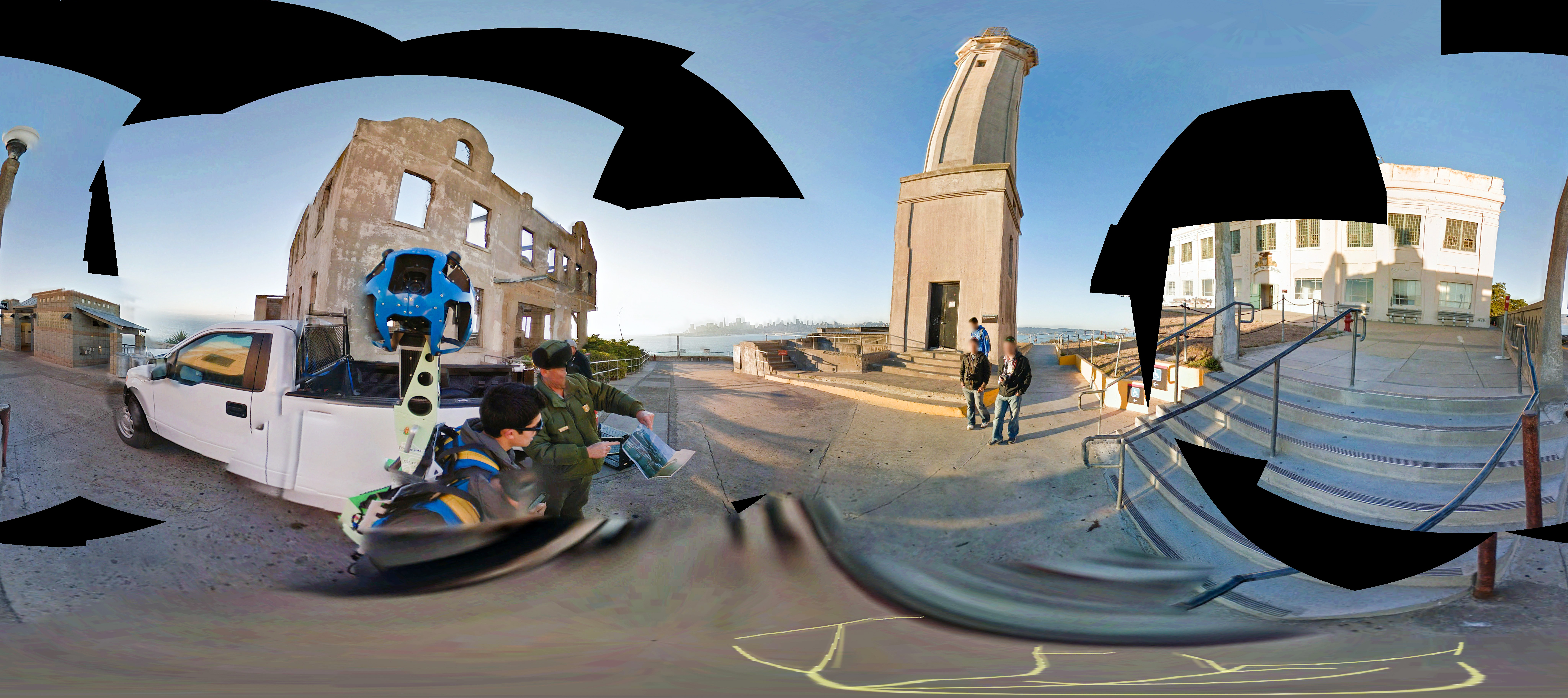 ALCATRAZ 5  2017 is a digital photo collage made from imagery found on Google Earth in Street View mode, in the vicinity of Alcatraz Island in San Francisco Bay. The image shows a person using a Trekker Street View Backpack, managing to somehow photograph himself… while photographing the images… that I used… to make this collage. I abused panoramic stitching software to assemble the images.