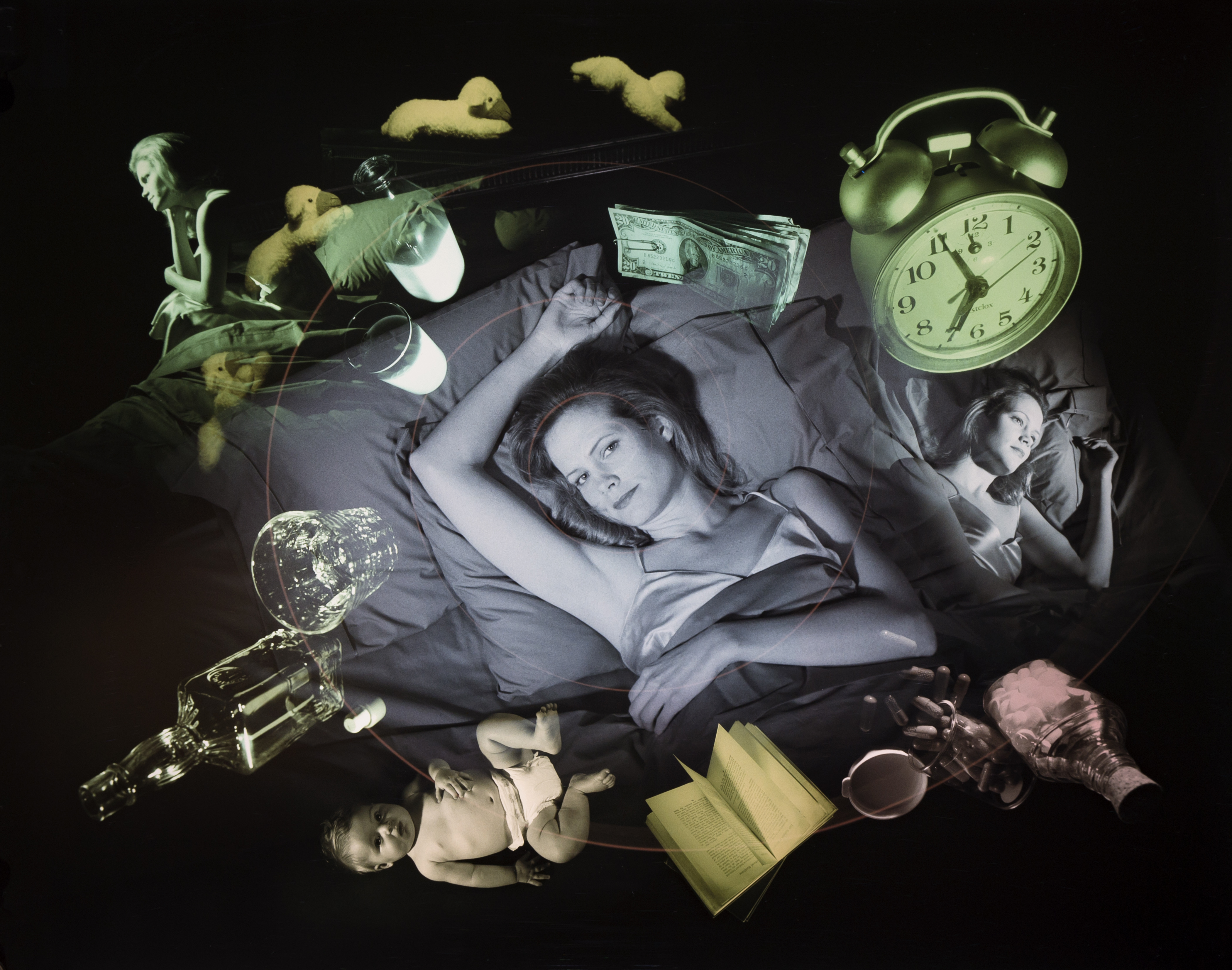 REDBOOK INSOMNIA 1994 is an analog multiple image Cibachrome print made from black & white transaparency film images, in a time before Photoshop. Created for Redbook Magazine in 1994.