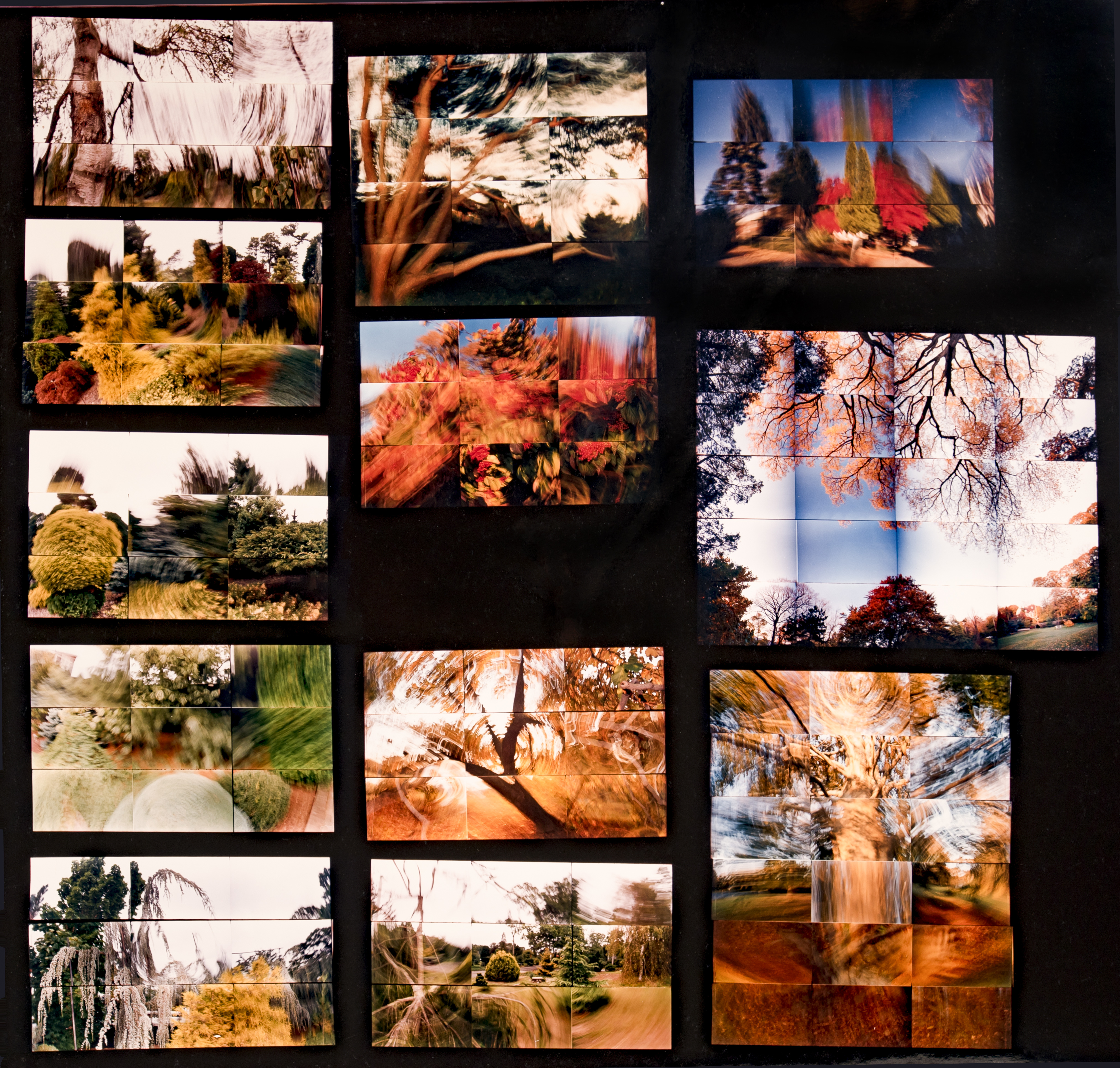 STUDIES 1988 is a group of analog photo collages on a single large contact print.  Shot on 35MM color film, using camera motion to create a painterly effect.  Taken with my trusty Olympus OM-1, which I had specially filed out by Marty Forscher of Professional Camera Repair in NYC, to eliminate the spacing in between frames. For similar images, please see: Early Collage