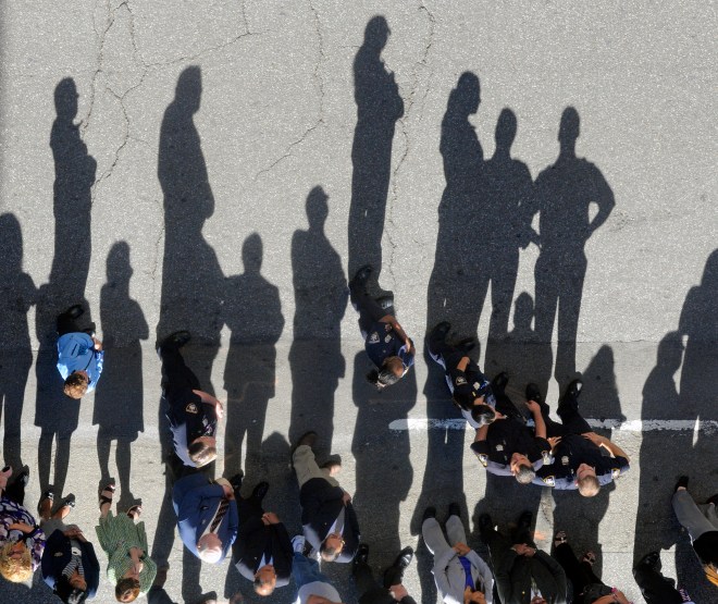 People and officers at ceremony honoring 3 court officers who died during 9-11 tragedy, in front of 111 Centre Street, NYC.