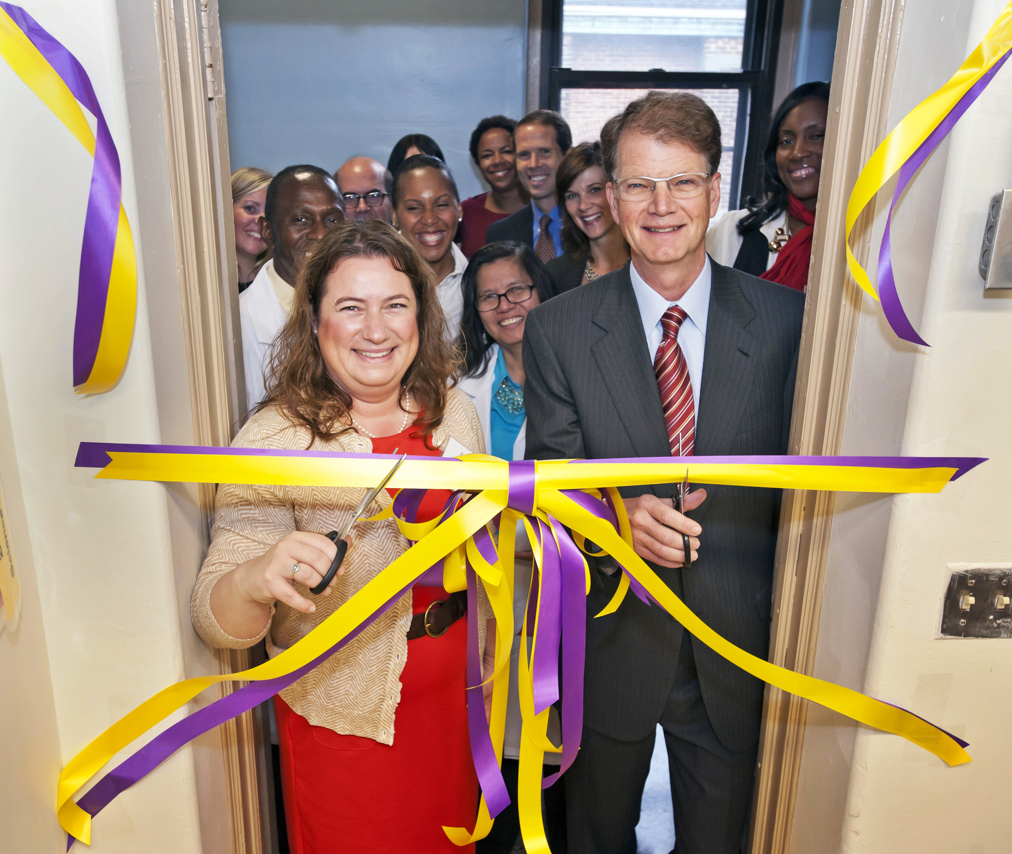 102512-NOVARTIS-LINK-1.jpg Robert Pelzer (right), U.S. head of Novartis, and Maria Paradiso (left), head of Link Community School, officially unveil the Novartis Science Lab and Science Wing in a ceremony at Link Community School.
