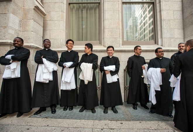 Scenes from the St. Patrick’s Day Parade, Fifth Ave, NYC. Group of priests outside St. Patrick’s cathedral after mass.