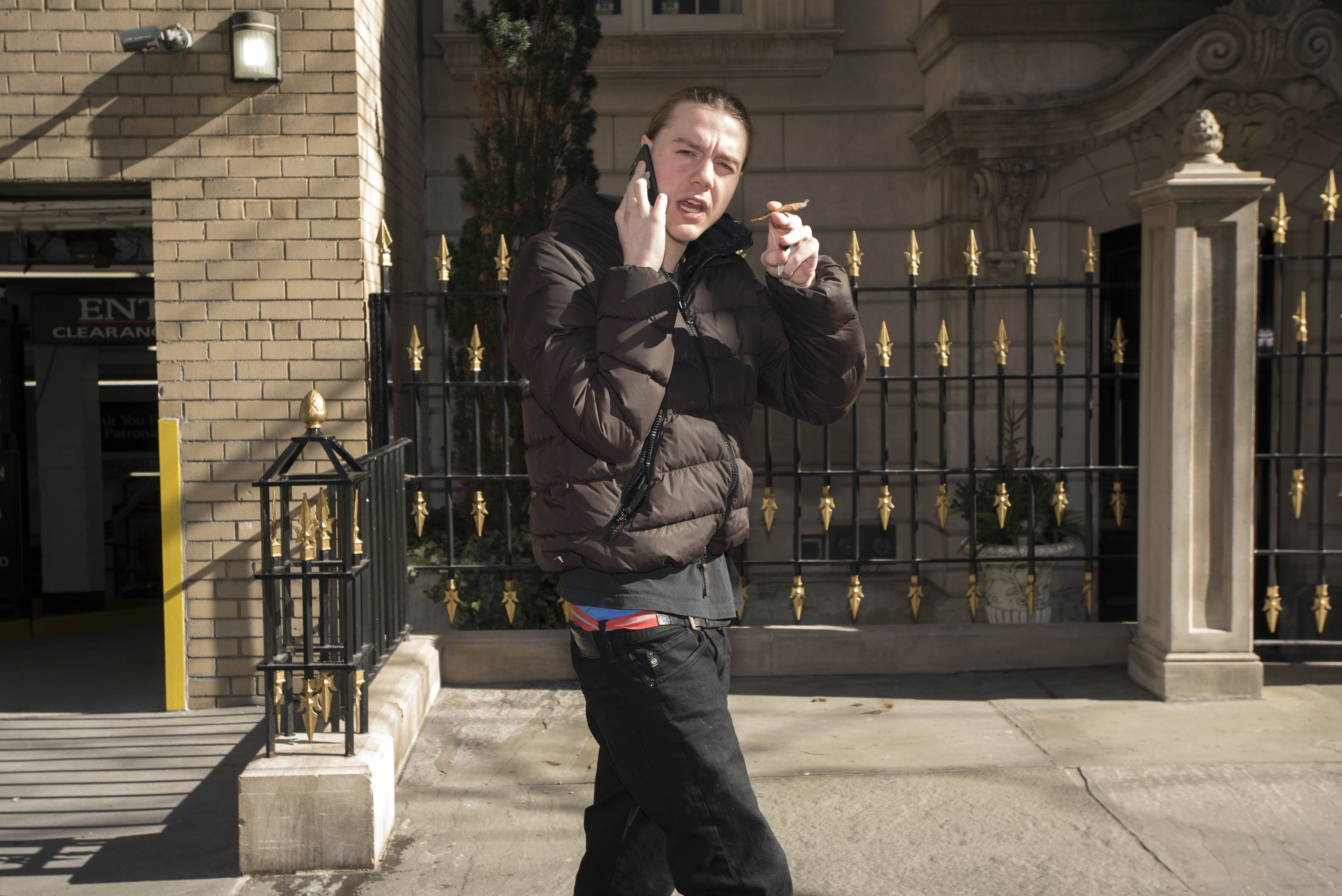 Billa Abbott, son of Gregory Abbott, involved in nationwide college scam, leaving his home this morning, 1020 Fifth Ave, NYC