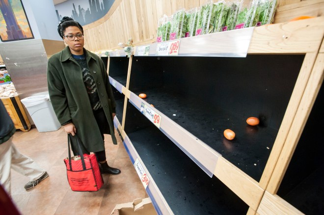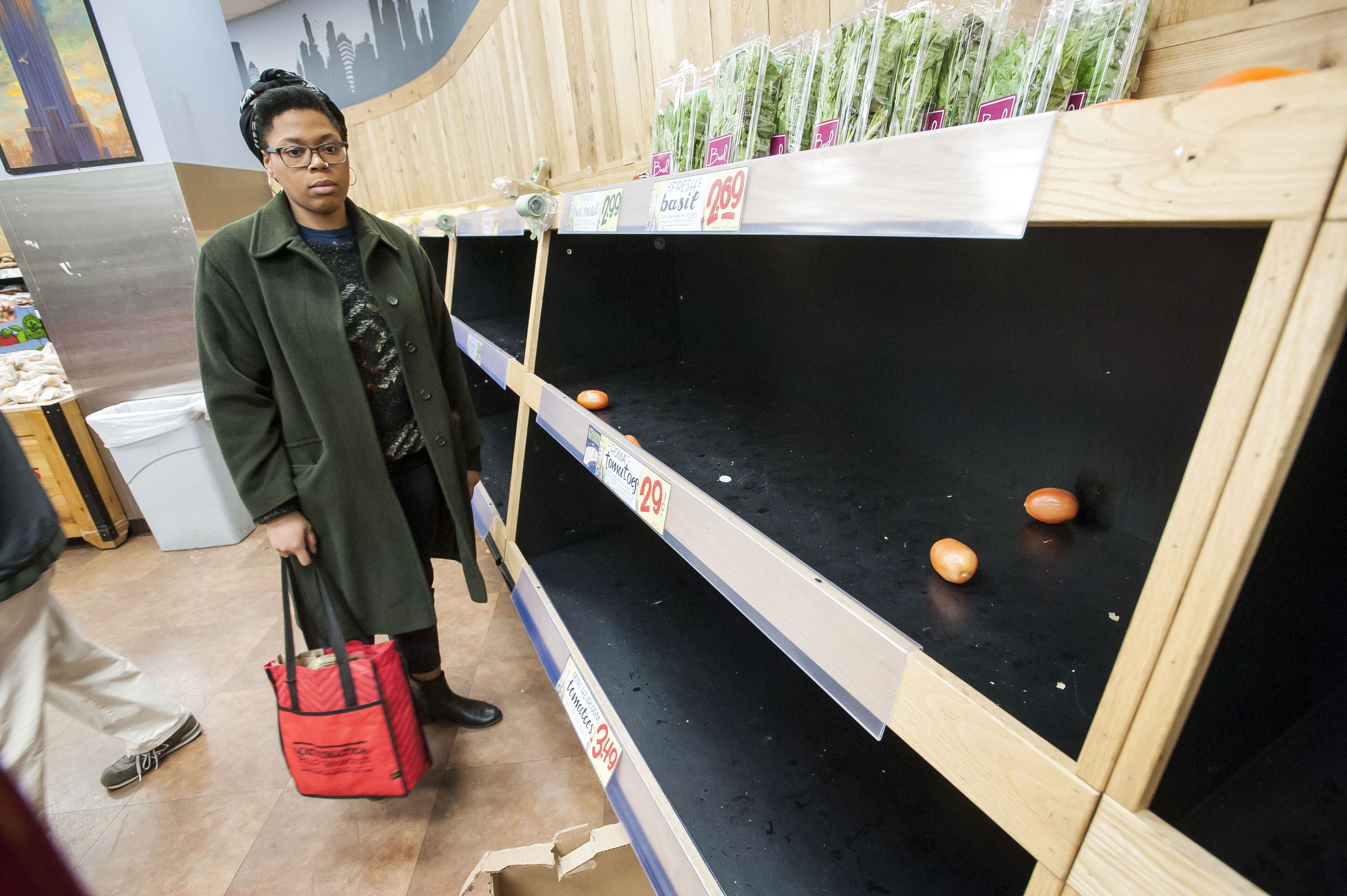 Shopper at Trader Joe’s next to empty produce shelves, as throngs of people shop for groceries on eve of predicted giant snowstorm, NYC